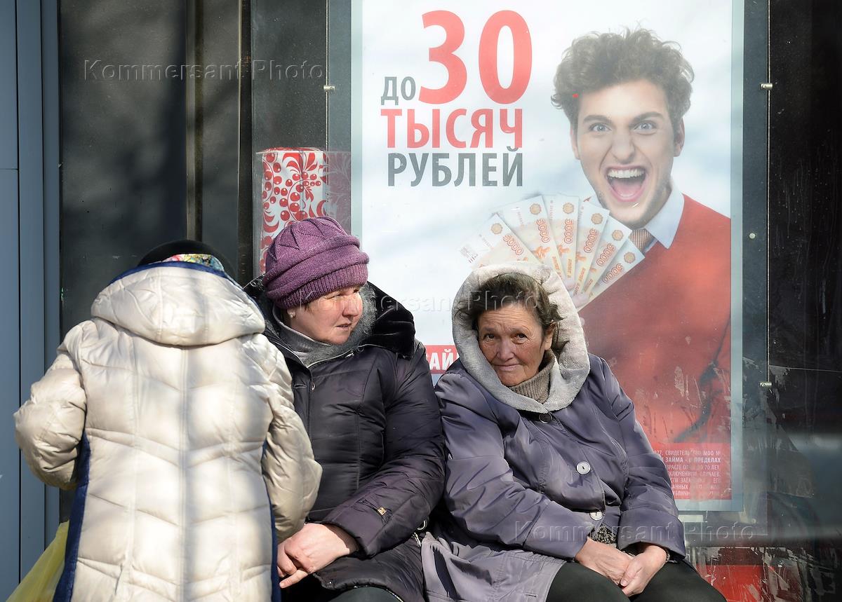 Жанровая фотография. Пожилые женщины сидят на фоне рекламы микрокредитов.