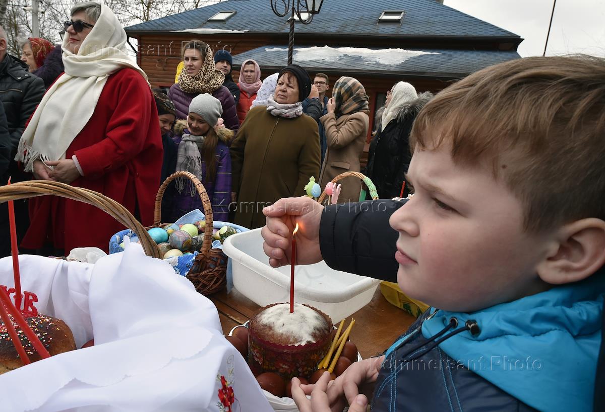 Освящение куличей в Успенском храме в деревне Обухово, Солнечногорский район.