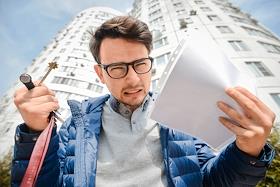 Жанровая фотография. Молодой человек с ключом и файлом с документами на фоне новостройки.