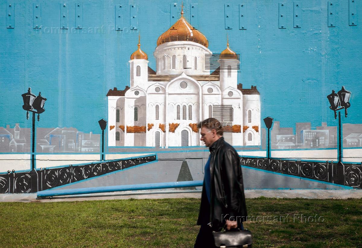 Жанровая фотография. Мужчина проходит мимо нарисованного храма.