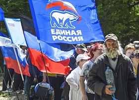 Жанровая фотография. Пожилой мужчина стоит на фоне флагов России и партии "Единая Россия".