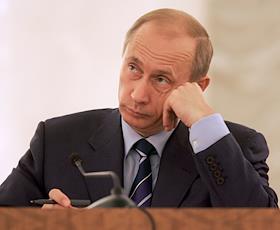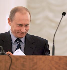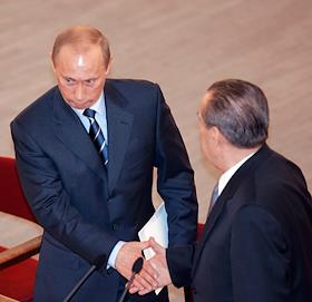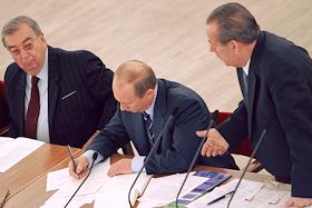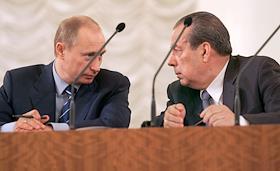 Президент России Владимир Путин (справа) и президент компании "Интеррос" Владимир Потанин (слева) на…