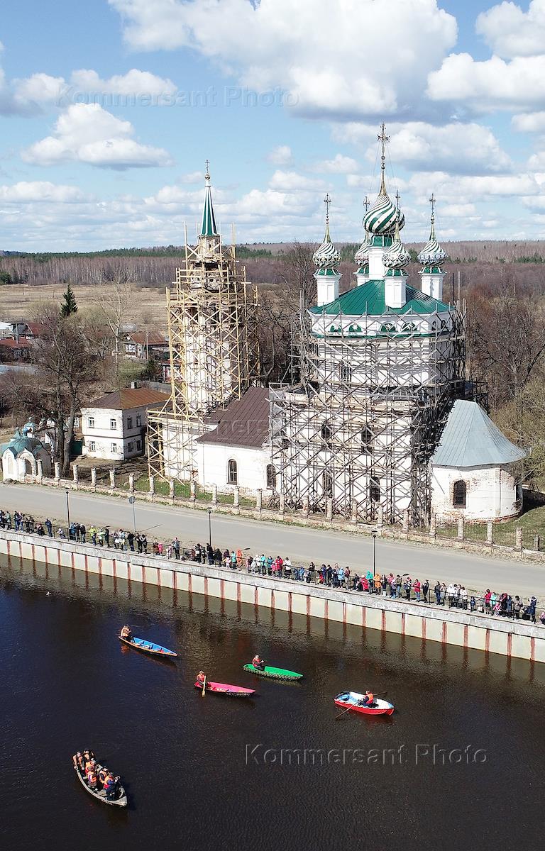 Виды села Холуй во время весеннего разлива реки Теза. Храмовый комплекс - Троицкая и Введенская…