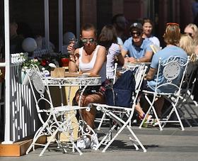 Кафе и рестораны на улице Рубинштейна. Посетители кафе за столиками, вынесенными на тротуар.