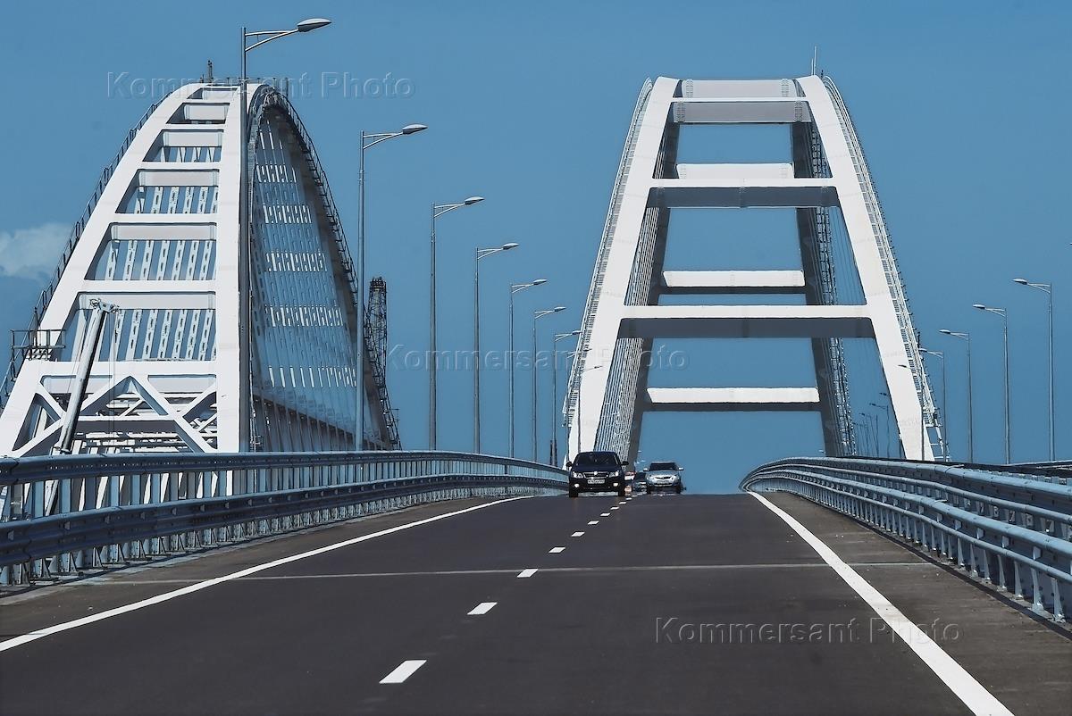 Начало автомобильного движения по Крымскому мосту. Участники байкерского клуба "Ночные волки" во…