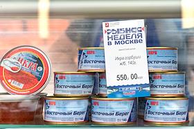 Гастрономический фестиваль "Рыбная неделя в Москве" на Площади Революции. Витриина с консервами с…