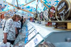 Гастрономический фестиваль "Рыбная неделя в Москве" на Площади Революции. Витрина с рыбными…
