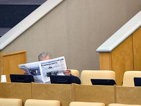Пленарное заседание Государственной думы (ГД) России. Жанровая фотография. Депутат ГД России читает…