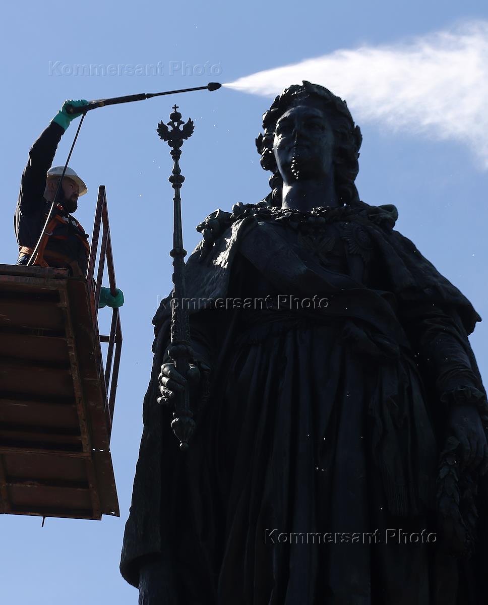 Помывка памятника Екатерине II на площади Островского.