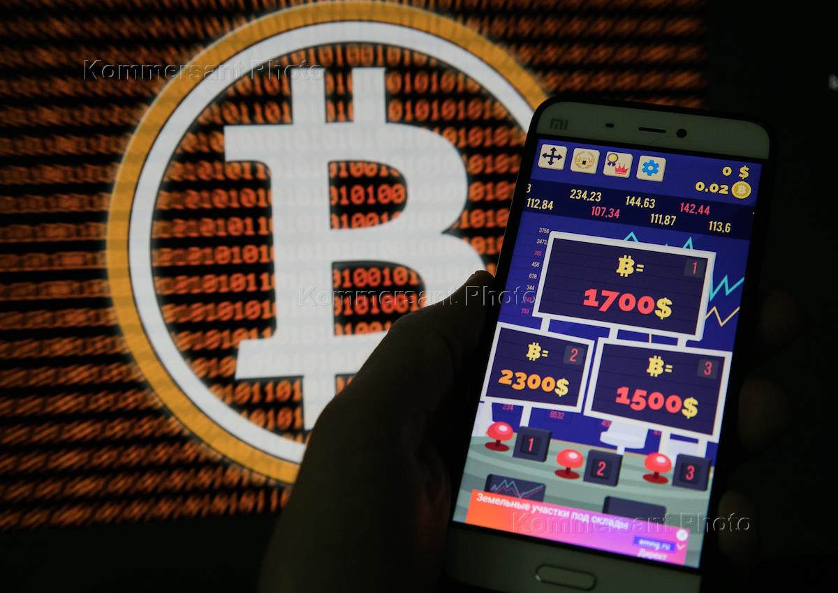 Жанровая фотография. Эмблема приложение Биткоина на экране мобильного телефона.