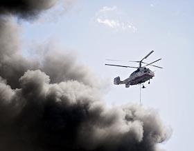 Пожар на складе на юго-востоке Москвы. Вертолет во время тушения пожара.