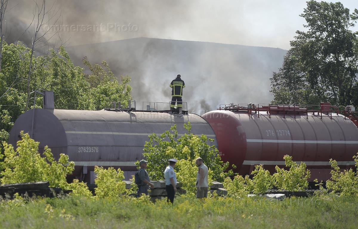 Пожар на складе на юго-востоке Москвы. Пожарный поезд во время тушения пожара.
