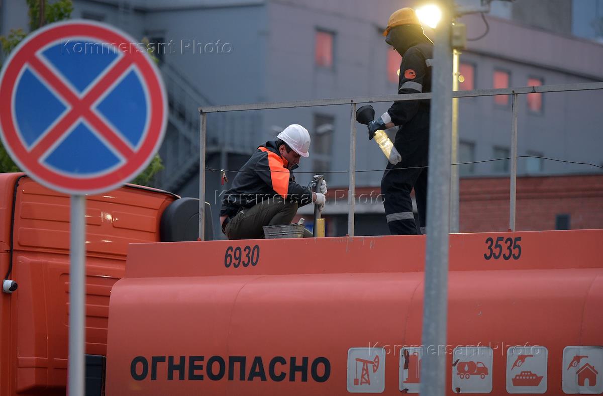 Жанровая фотография. Автозаправочная станция (АЗС). Сотрудники АЗС на бензовозе перед сливом бензина…