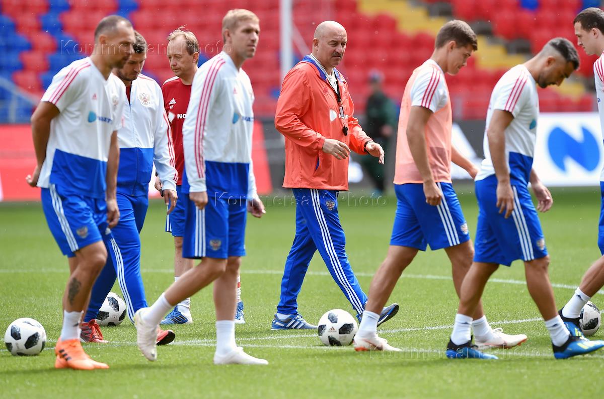Главный тренер сборной команды России по футболу Станислав Черчесов во время тренировки перед…