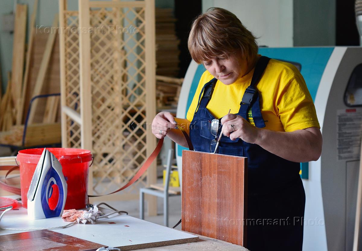 Жанровая фотография. Работа столярной мастерской. Сотрудница мастерской у пожарного щита.
