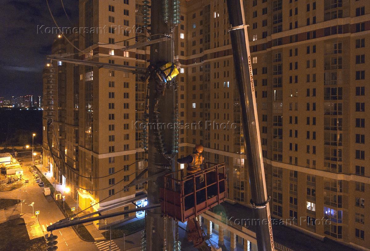Демонтаж опор ЛЭП в зоне строительства Южного дублера Кутузовского проспекта. Монтажник во время…