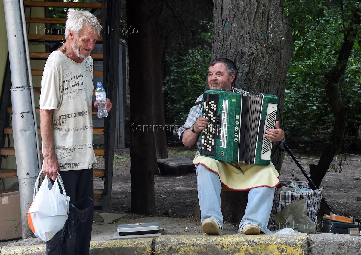 Жанровая фотография. Пожилой мужчина уличный музыкант играет на баяне для прохожих.