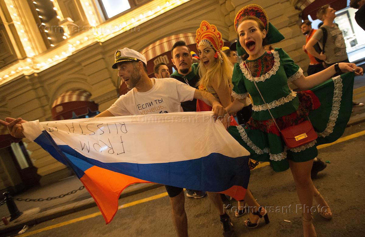 Народные гулянья в центре Москвы в честь победы сборной России по футболу в груповом этапе Чемпионата Мира по футболу 2018