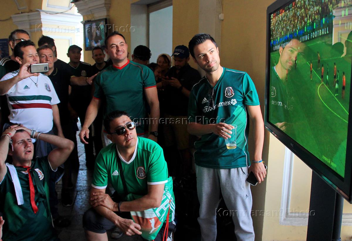 Досуг, туризм и отдых Чемпионат Мира по футболу в России FIFA 2018. Болельщики сборной Мексики на галерее Гостиного двора смотрят мачт сборных по футболу Германии и Кореи.