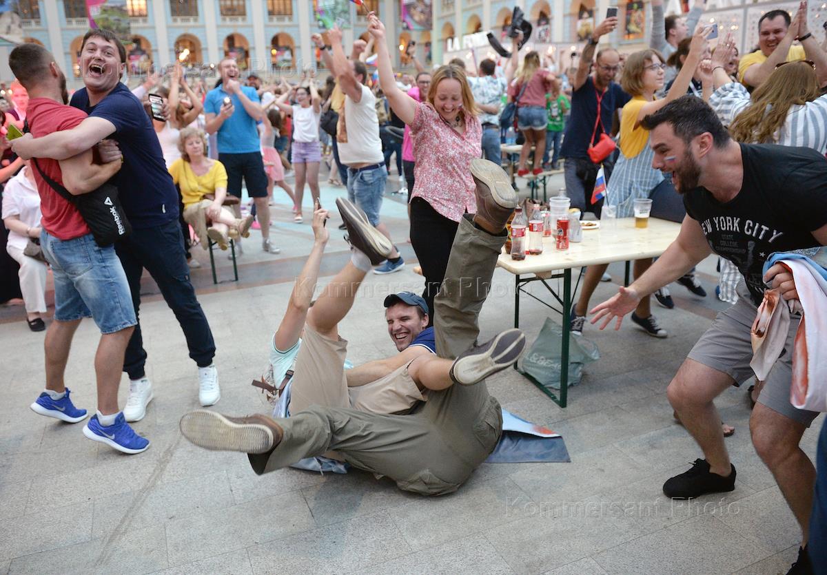 Досуг, туризм и отдых Чемпионат мира по футболу в России FIFA 2018. Гуляния болельщиков на Никольской улице. Болельщики смотрят матч между сборными Испании и России в Доме Мексики в Гостином Дворе.