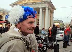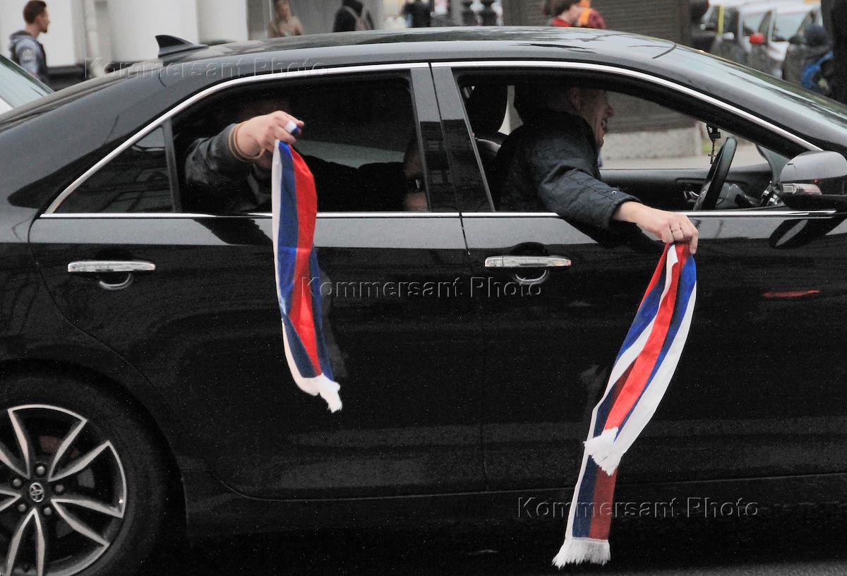 Чемпионат мира по футболу в России FIFA 2018. Болельщики сборной России на Невском проспекте празднуют победу над Испанией.