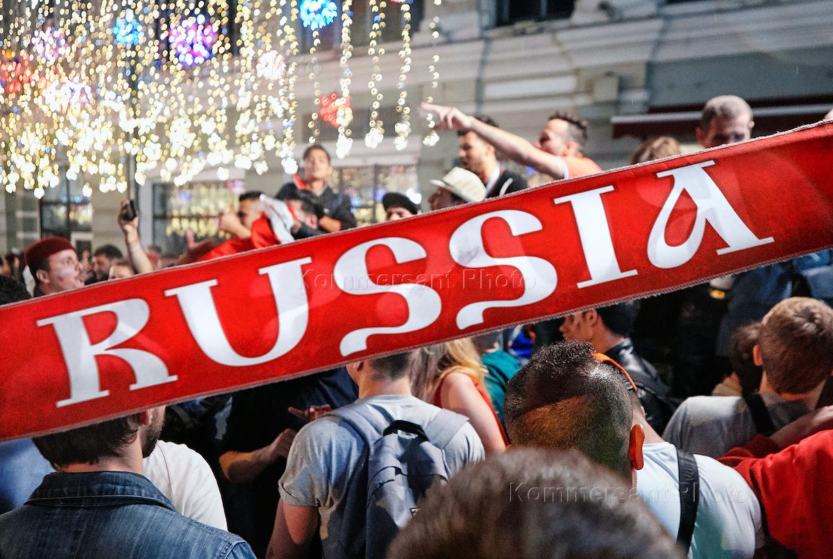 Досуг, туризм и отдых Чемпионат мира по футболу в России FIFA-2018. 1/4 финала. Болельщики сборной России в центре Москвы после матча между сборными России и Хорватии.