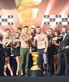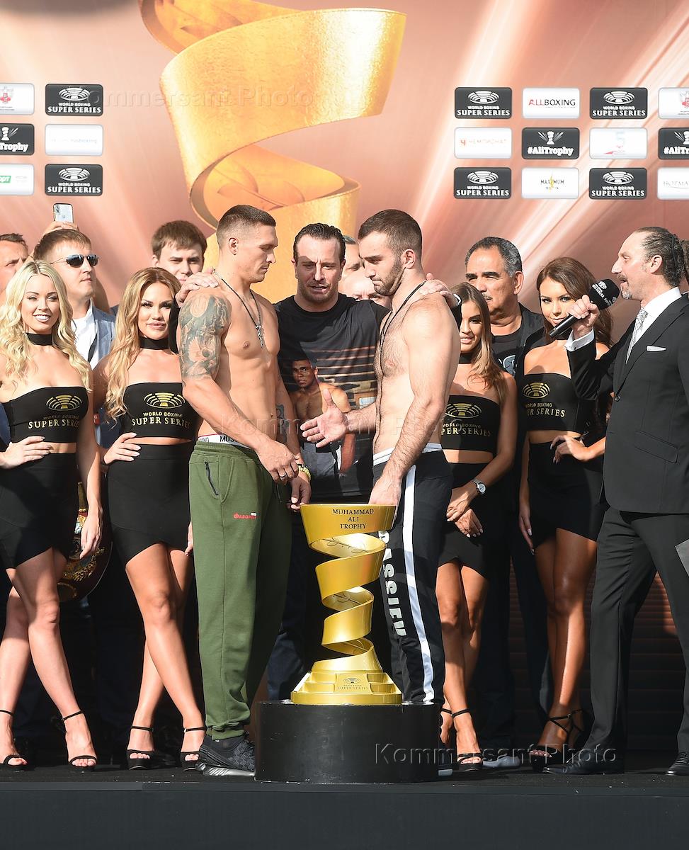 Церемония взвешивания боксеров Мурата Гассиева и Александра Усика перед финальным боем Всемирной боксерской суперсерии (WBSS).