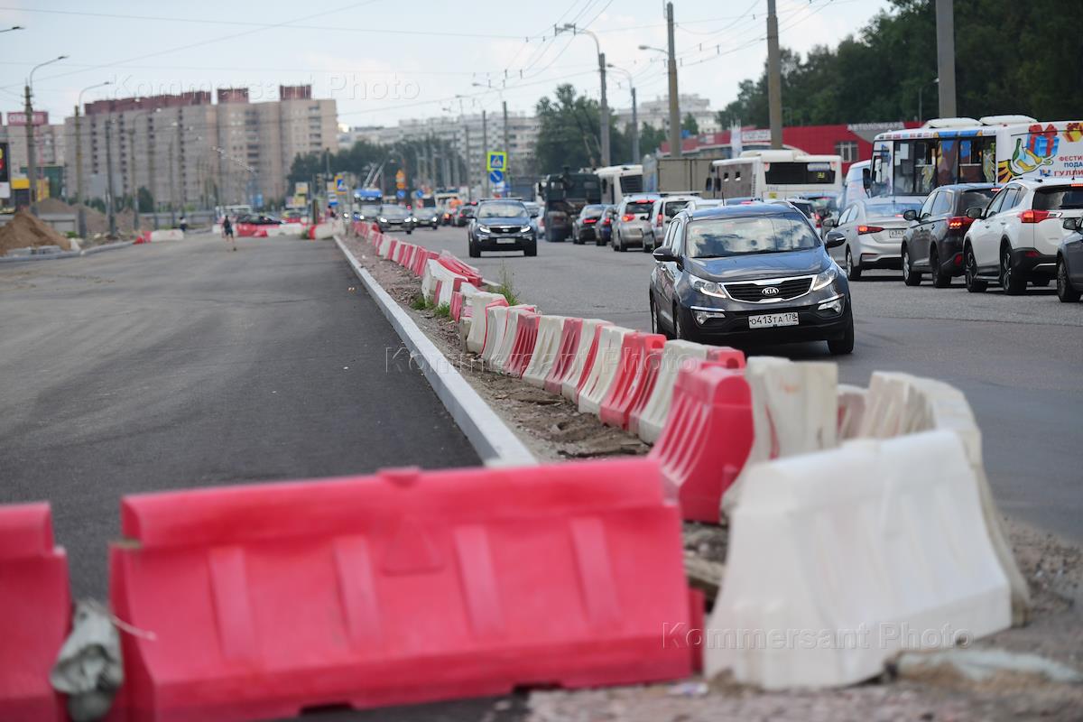 Жанровая фотография. Ремонт проезжей части Богатырского проспекта. Огражление на участке от улицы…