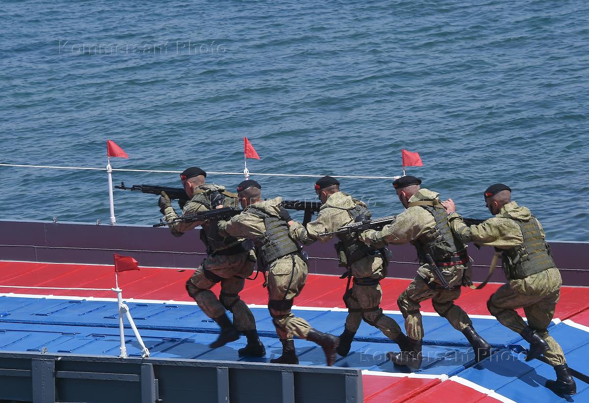 Военно-морской парад в День Военно-Морского Флота (ВМФ) России. Морские пехотинцы во время…