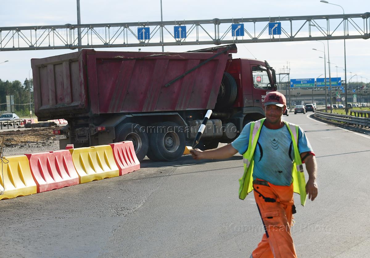 Рабочий-регулировщик во время работ по расширению Северного участка КАД.
