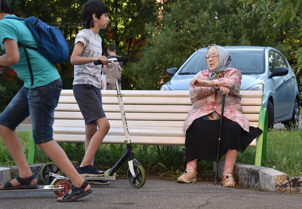 Жанровая фотография. Пожилая женщина сидит на скамейке в парке.