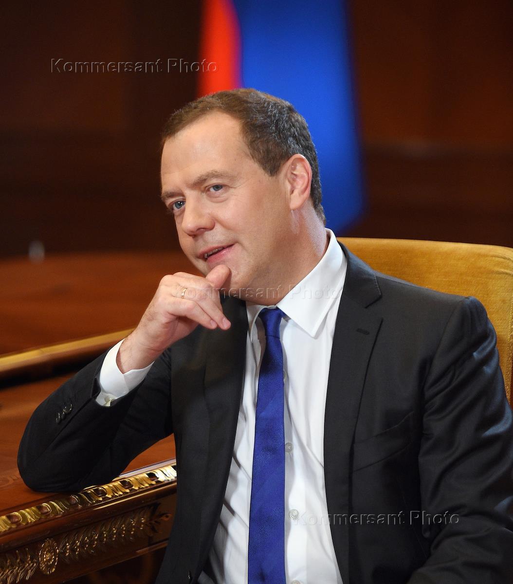 Председатель правительства России Дмитрий Медведев во время интервью.