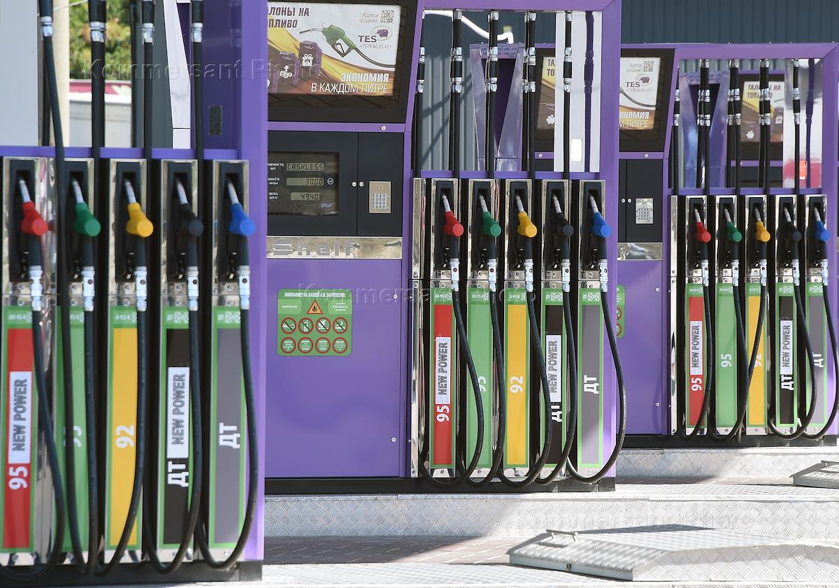 Автозаправочная станция (АЗС) компании TES (ТЭС). Сотрудник АЗС во время заправки бензином…