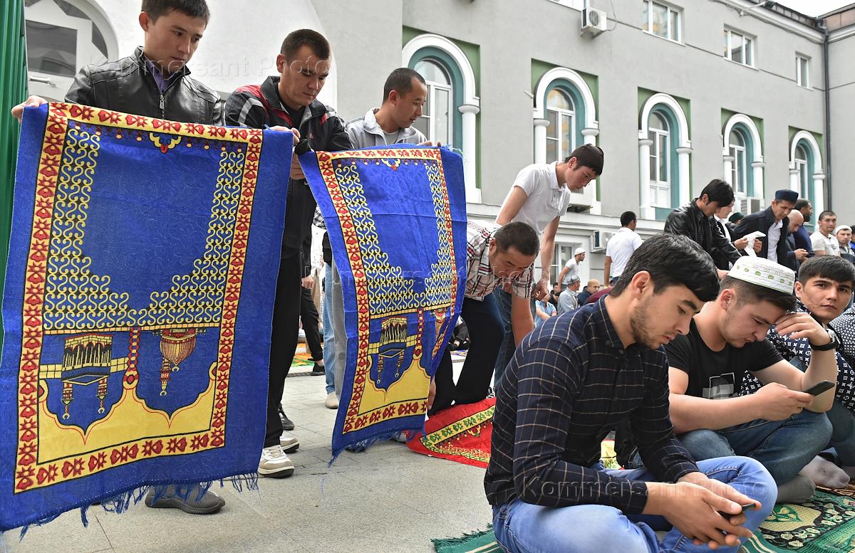 Праздник жертвоприношения Курбан-Байрам в Московской Соборной мечети. Верующие перед началом намаза.