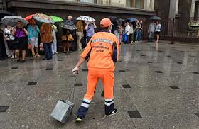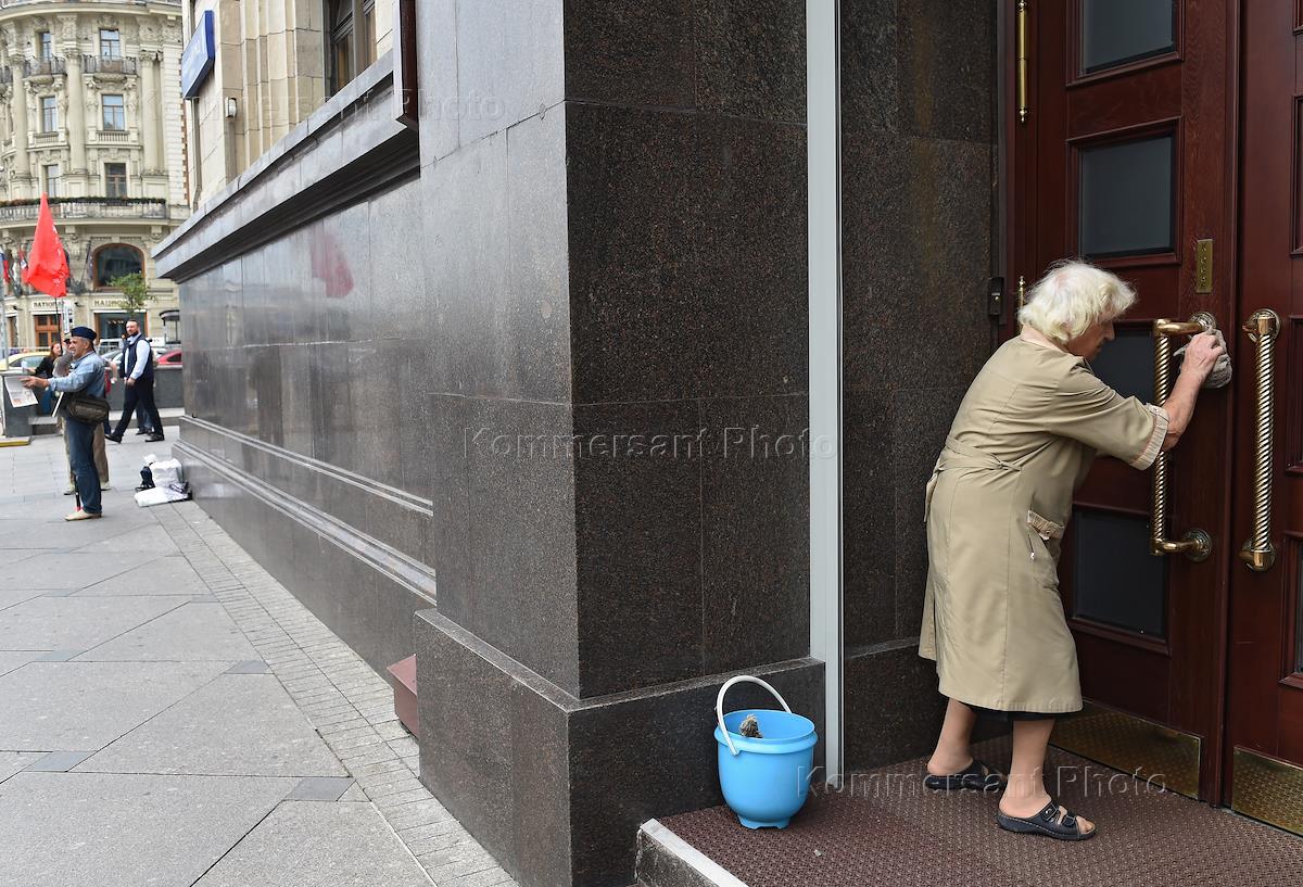 Жанровая фотография. Уборщица моет ручку двери одного из подъездов здания Государственной думы (ГД)…