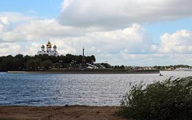 Вид на Стрелку - мыс на слиянии рек Волга и Которосль-от храмового комплекса в Коровниках.