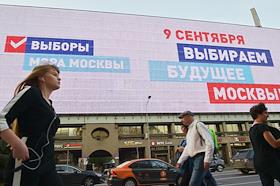 Предвыборная кампания по выборам мэра Москвы. Информационный плакат о дате выборов на улице города.