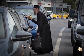 Жанровая фотография. Рука из окна автомобиля протягивает священнослужителю яблоко.