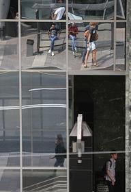 Жанровая фотография. Отражение людей в стеклянном здании.