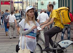 Предвыборная кампания по выборам мэра Москвы. Девушка-волонтер с информационными листовками о дате…