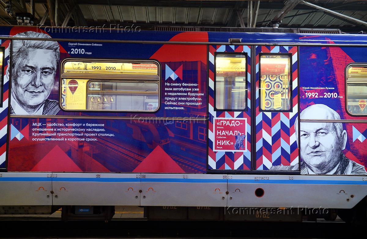 Жанровая фотография. Поезд метрополитена с портретами мэров Москвы - бывшего Юрия Лужкова и…