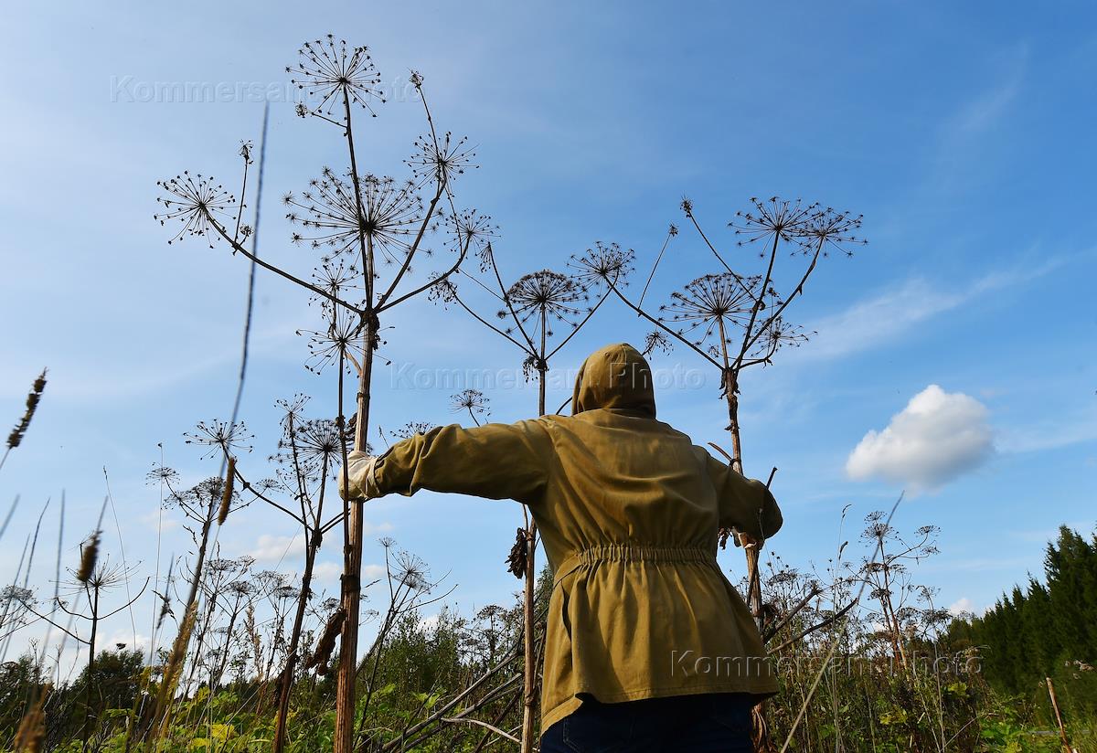 Жанровая фотография. Мужчина в экипировке с помощью садовых ножниц режет стволы борщевика.