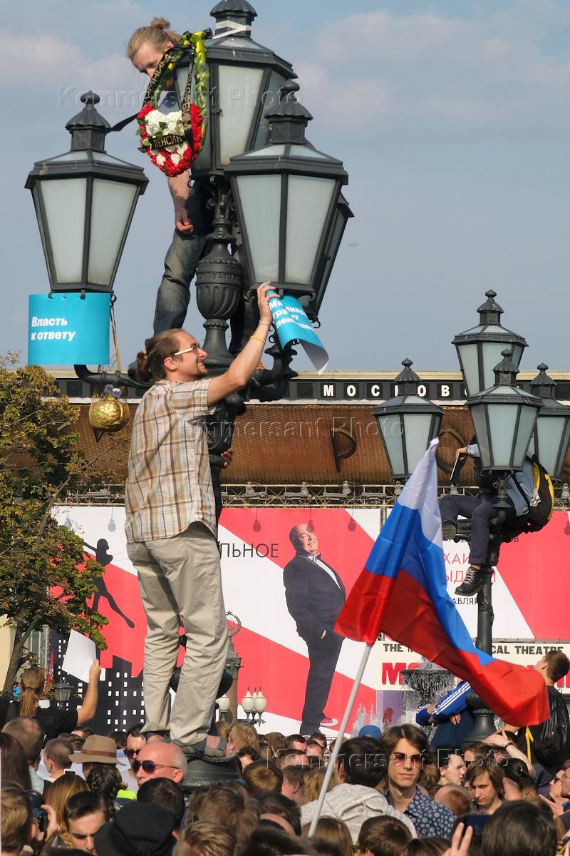 Митинг против пенсионной реформы прошел на Пушкинской площади. Участники во время митинга.
