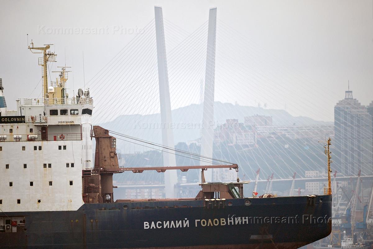 Жанровая фотография. Корабль "Василий Головнин" и Золотой мост — вантовый мост через бухту Золотой…