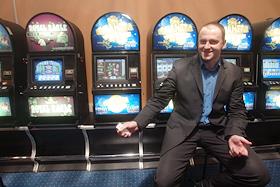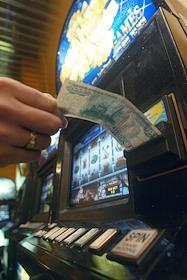 Посетитель вкладывает тысячную купюру в игровой автомат в клубе "Планета удачи".