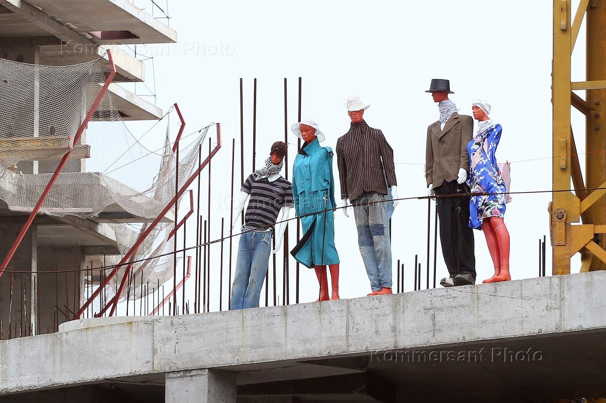 Инсталляция из наряженных манекенов, организованная обманутыми дольщиками ГК "Квартстрой" в недостроенном ЖК "Европейский квартал".