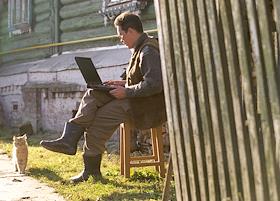 Человек с ноутбуком во дворе деревенского дома возле поленницы. Рядом гуляют кошка и курица.