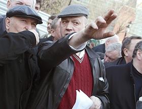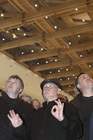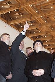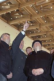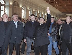 Мэр Москвы Юрий Лужков (в центре) осматривает здание Манежа, восстановленное после пожара.…