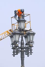 Рабочий на подъемнике моет уличный фонарь на Манежной площади.