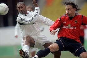 Игрок футбольной команды "Сатурн" Виктор Онопко (слева) и игрок команды "ЦСКА" Милош Красич (в…